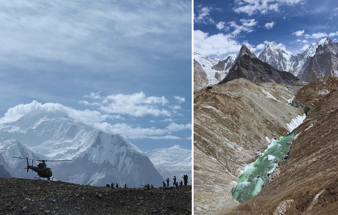 6 Aug - Set off early from Paiyu. We hiked up onto the massive Baltoro Glacier, which fills the entire valley. Said goodbye to the Braldu River and valley—now it’s rocky trails, up and down glacier moraines, and rounding icy green lakes. Reached Liligo in 5 hours for a pasta and mango lunch, then continued another 4 hours to Kuburtse Camp. Luckily, we crossed the Kuburtse River on a wooden bridge. Big day, big dinner. Good night!