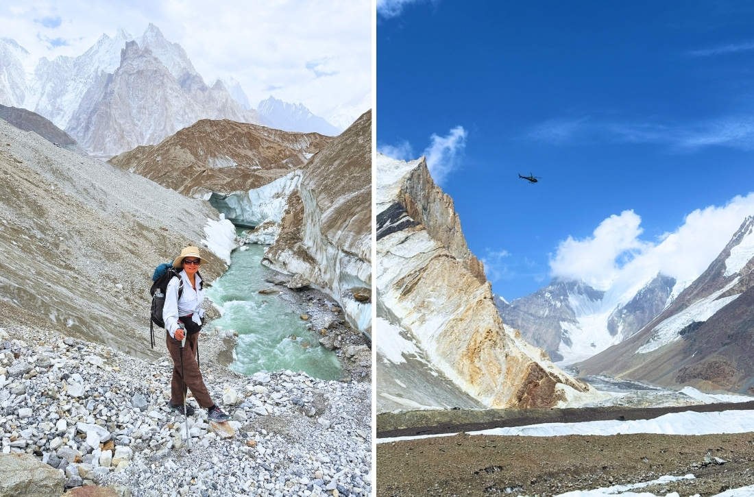 9 Aug - Today we woke up early and began our trek under sunny skies. A large piece of ice broke loose from the mountain above us, tumbled down, and shook the ground—scary! We crossed the Baltoro Glacier, balancing over a glacial stream on two bamboo poles. After a nice lunch break at Goro 1, we continued over gently rolling moraines to Goro 2, where we camped on the glacier. A good dinner and a good night followed.