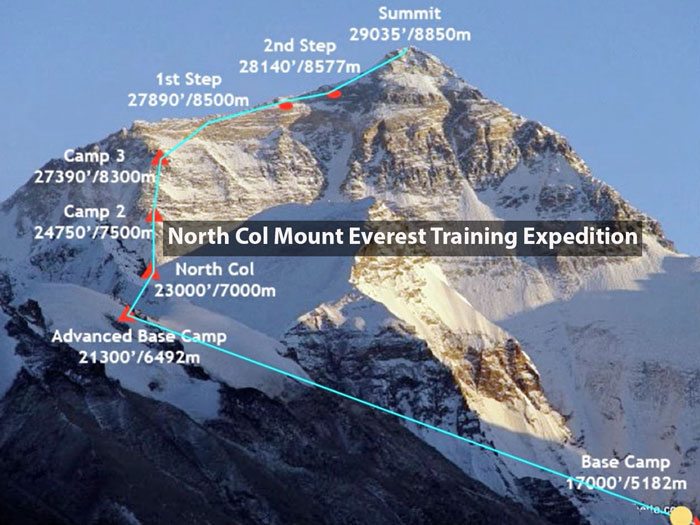 The North Col on Everest is 7000 meters/23,000 feet high. It is a spectacular location with incredible views and on main climbing route for Everest from Tibet. The North Col is located on a high snow ridge above advanced basecamp. We teach you everything you need to know to climb to the North Col in special training sessions in base camp. The climbing could be best described as steep walking and easy/moderate climbing with climbers attached to fixed ropes. The dates we have chosen run in conjunction with the exciting spring Everest climbing season. Climbing up to the North Col could qualify you for climbing Everest