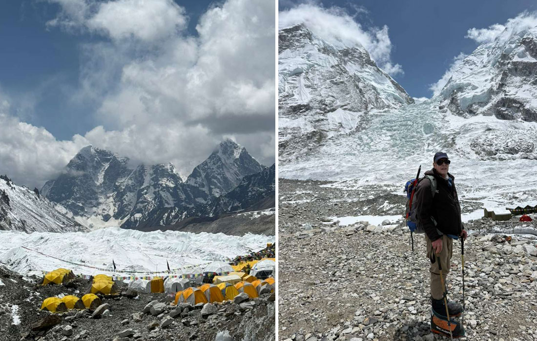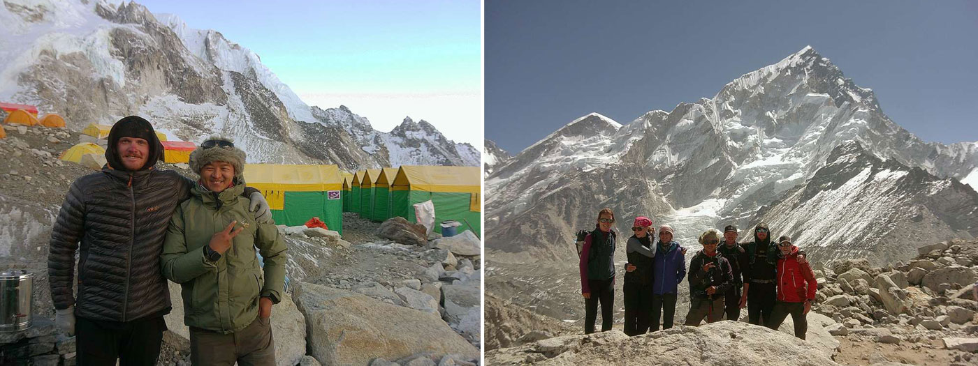 Caption : Team member and climbing sherpa at BC. Hiking around Everest Base Camp. Photo : Luke.