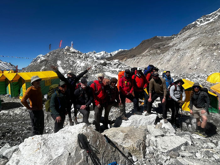 17 April - Sun hit our Lobuche Lodge brightly this morning and we walked up a long flat river valley, climbed a rocky hill and stumbled across a huge messy glacial moraine boulder field to the village of Gorak Shep. Plenty of heavy breathing up here but at least it is super sunny. We take lunch at the lovely warm Himalaya Lodge dining room, and then carry on across a dry muddy lakebed along a very long ridge in shadow of mighty Mount Pumori towering above us on our left. We traverse the lateral moraine beside the enormous Khumbu Glacier itself, which is nowadays rather rock covered. Finally we reach a large rock pile at the head of the lateral moraine. We stop for a moment to appreciate the vast sea of yellow and white tents in the distance, on the rising swell of the rock covered Khumbu Glacier. The Khumbu Icefall tumbles down between the West Ridge of Everest and the flanks of Mount Nuptse. Stunned to silence, by the spectacle before us, one which we are bound to climb, we follow a gravel ramp down onto the Khumbu Glacier and in a few minutes of hopping over boulders we are at the famous iconic Everest Basecamp Rock. Basecamp starts here, and it’s a non stop tent city from here on. Our Sherpas guide us through a maze of nylon until we find our SummitClimb basecamp tucked in a secluded back bowl. A tough day to be sure, but it feels very good to finally be here.