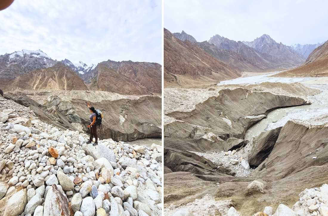 6 Aug - Set off early from Paiyu. We hiked up onto the massive Baltoro Glacier, which fills the entire valley. Said goodbye to the Braldu River and valley—now it’s rocky trails, up and down glacier moraines, and rounding icy green lakes. Reached Liligo in 5 hours for a pasta and mango lunch, then continued another 4 hours to Kuburtse Camp. Luckily, we crossed the Kuburtse River on a wooden bridge. Big day, big dinner. Good night!