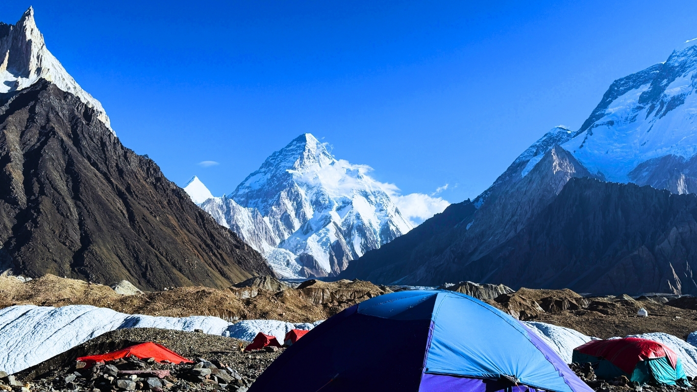 11 Aug - Rest day today at Concordia. The weather is sunny, with blue skies and no wind. There are about 10 other groups here. We have 360-degree views of huge mountains and glaciers in every direction. Highlights include the spiky black Mitre Peak just above us, Gasherbrum IV with its shining marble wall, and, of course, K2, which fills the entire valley to the north. Today we heard that K2 was summited at around 2 in the afternoon. This evening, we watched in amazement as a string of headlamps made its way down from the summit in the darkness. Good night, and may Godspeed.