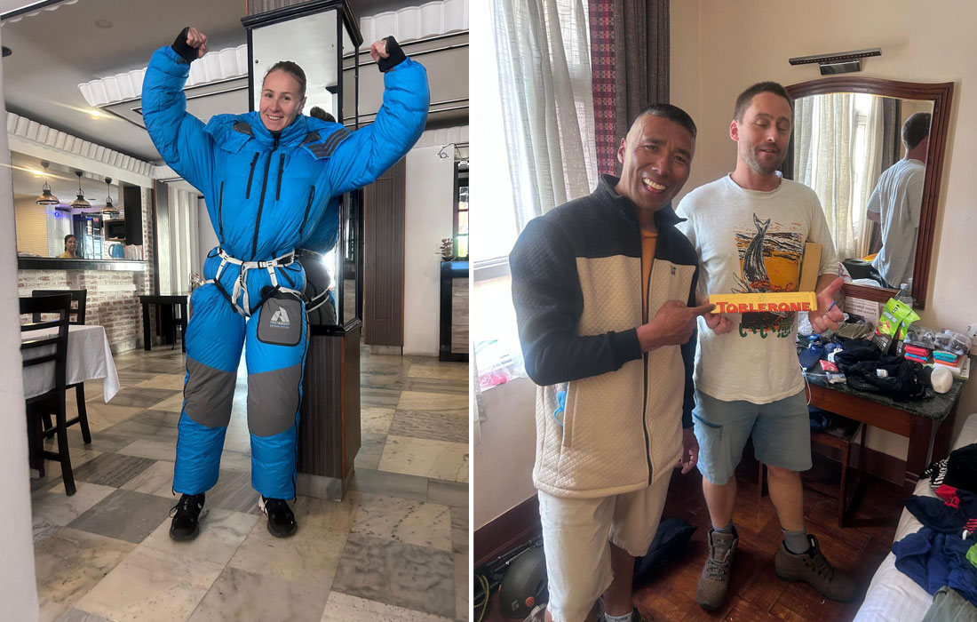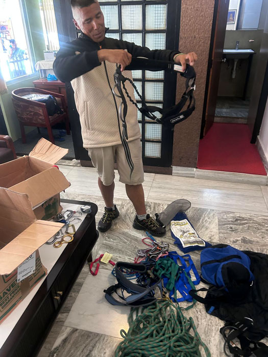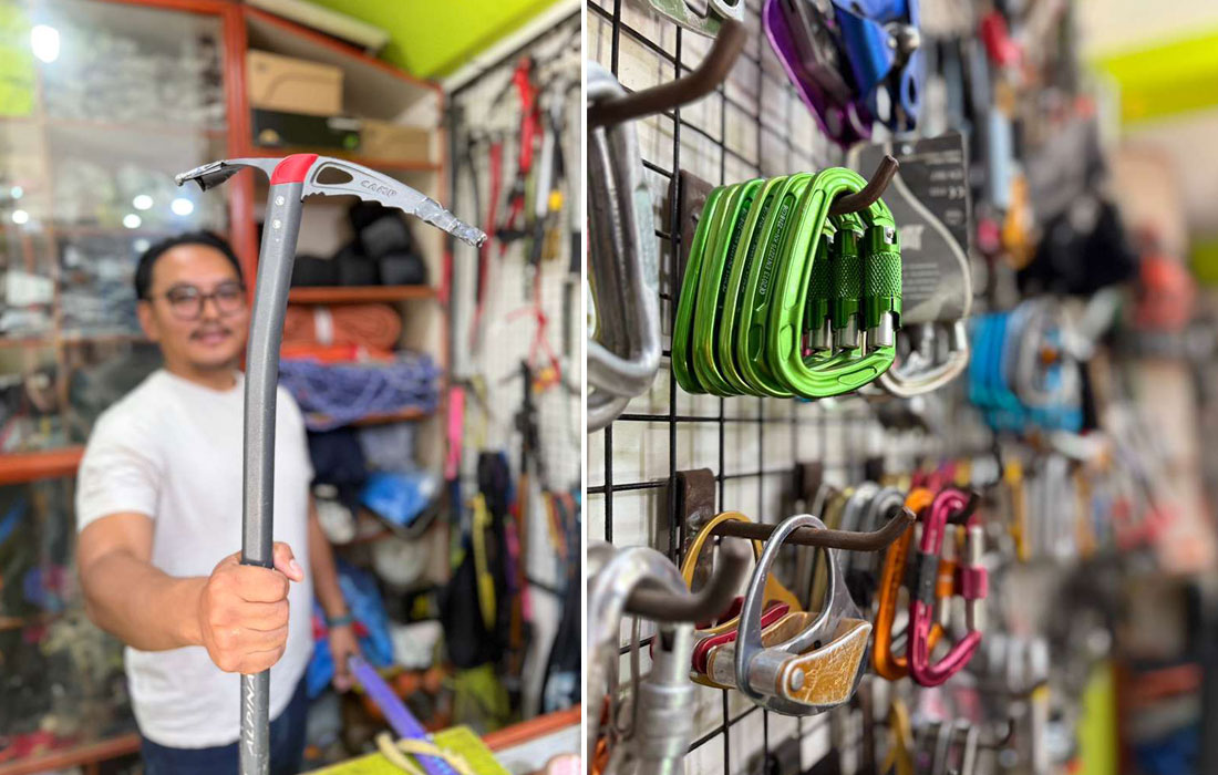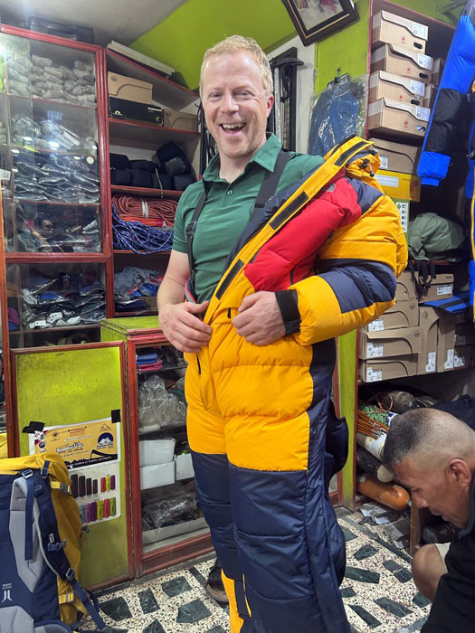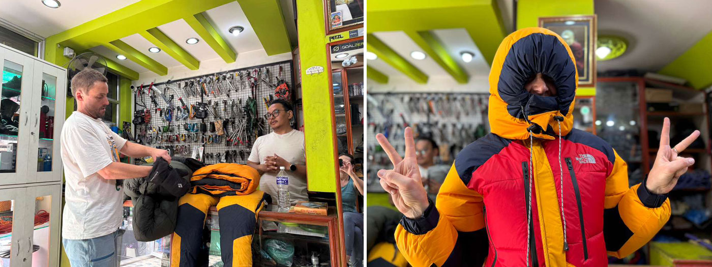 Caption : We checked some more member’s gear and went shopping to rent/hire their high altitude down gear, mitts, boots, and sleeping bags.