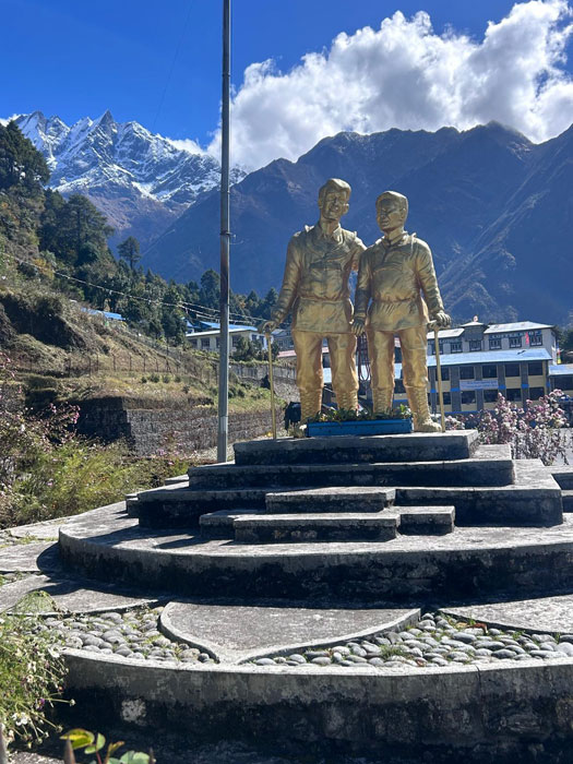 Caption : New Tenzing and Hillary statue on a beautiful sunny day at Lukla Airport. Photo Dan.