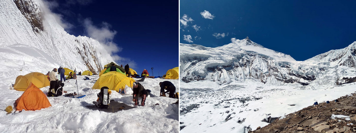 Caption : Getting ready to climb to the next camp. Photo Tenji. The majestic pinnacle of Manaslu, seen from Base Camp.