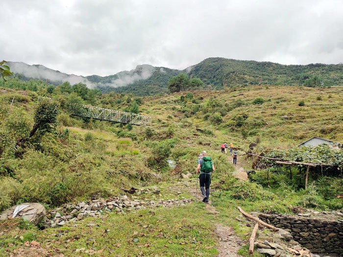 8 Oct - Today our team hiked from Khola Kharka to Kothe (3,500m / 11,483ft), following a beautiful, ever-changing mountain trail. The path wound along grassy hillsides and descended through lush forests, offering glimpses of distant snowy peaks and the serene Panch Pokhari. We arrived at Kothe — a peaceful mountain village nestled among green slopes and towering summits. All members and Sherpas are in good health.