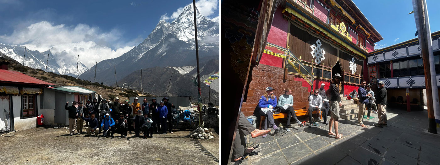 Caption : Team photo of Everest Massif and Ama Dablam from giant Guru Rinpoche Statue at the top of Pangboche. Waiting our turn to go inside at Pongboche Monastery Photo : Dan.