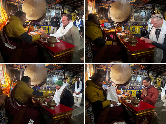14 April - Today we wake up in Pangboche Sonam Lodge a bit late and a bit sore from yesterday’s big walk. After a generous breakfast in the dining room with massive plate glass window views of the now sparkling clear, but cloud top tufted Everest Massif and Ama Dablam, the best views of any dining room in the Khumbu, we prepare to head up to the Pangboche Monastery to receive our blessing for this expedition and trek we are currently on. We each buy a prayer scarf “Katta” and roll a few hundred rupee notes inside. Walking up through old Pangboche village we pass swelling piles of hand carved mani prayer stones, each the Size of a pizza or so, yet much thicker. Each pile could contain 100 mani stones or more. There is an abundance of tall fat Juniper trees here; Sherpas have been living in this well protected alpine bowl since 1586, which is right around the time the Sherpas came over from Tibet. In fact Sherpa means “Eastern People” in Tibetan language. Our brief good morning walk ends at the Pangboche monastery. We remove our shoes, buy our tickets and pad up the narrow stairway to check out the ancient prayer hall. Walls covered in hand painted scenes of deities, glass panels on one side behind which are some very golden elaborately decorated statues. One highlight is a small locked wooden box bolted to a pillar. A monk opens the box to reveal a preserved yeti’s scalp and hand. Shocking. Taken aback, not sure what to think about this. Time to climb a wee windy stairway to the upper floor. This room is lined with scary looking masks, statues of golden deities looking benevolently out from behind glass panels. One highlight is a pillar covered a massive stack of prayer shawls, which when lifted aside, reveals ancient armaments: swords, knives, helmets, shields. At the end of the room a blanket wrapped Lama sits cross legged on a raised dais. We perch on cushions around him. He begins chanting, murmuring, and banging on his big hanging drum. Thump Thump Thump. The acred smell of incense fills the air. From time to time he stops to sprinkle water with a peacock feather, toss handfuls of rice up into the air, play a small double sided handheld prayer drum. Tik tok, tik tok, tik tok. Our sherpas fill pots with rice wine and hold them aloft. After a bit, each of us kneel before the lama and present our prayer scarf to him, he shakes out the donation, says some special chants and carefully, delicately places the glistening white scarf over our head. We put our palms together and stand up. Fully blessed, and in a sort of peaceful state approaching shock, we file out of the darkened temple into bright sunlight and walk along the perimeter of the building spinning 100s of small copper prayer wheels set into the wall. They twirl with a rattling noise. We enter a small tall well decorated red building containing an enormous larger than life prayer wheel. Grabbing handles at its base we walk around in a clockwise direction as the prayer wheel spins. Upon each rotation, a bell rings, perhaps reminding us how many times we have completed our journey around, lest we become disoriented in the peace of the moment. We climb a steep hill behind the monastery up through grandmotherly junipers to visit the 8 metre high Guru Rinpoche statue, topped with an elaborate crown, holding a tall spear, wearing ancient clothing made from the land, guarded by snarling dragons, festooned with massive jewels. What a spot for a group photo, Ama Dablam, Everest, Nuptse with wind blasted clouds tearing through them. A powerful sight and humbling feeling indeed. We feel small, yet amazed to be here, and ready for our next steps. It’s time to begin today’s short trek up to Dingboche Village. Let’s go!