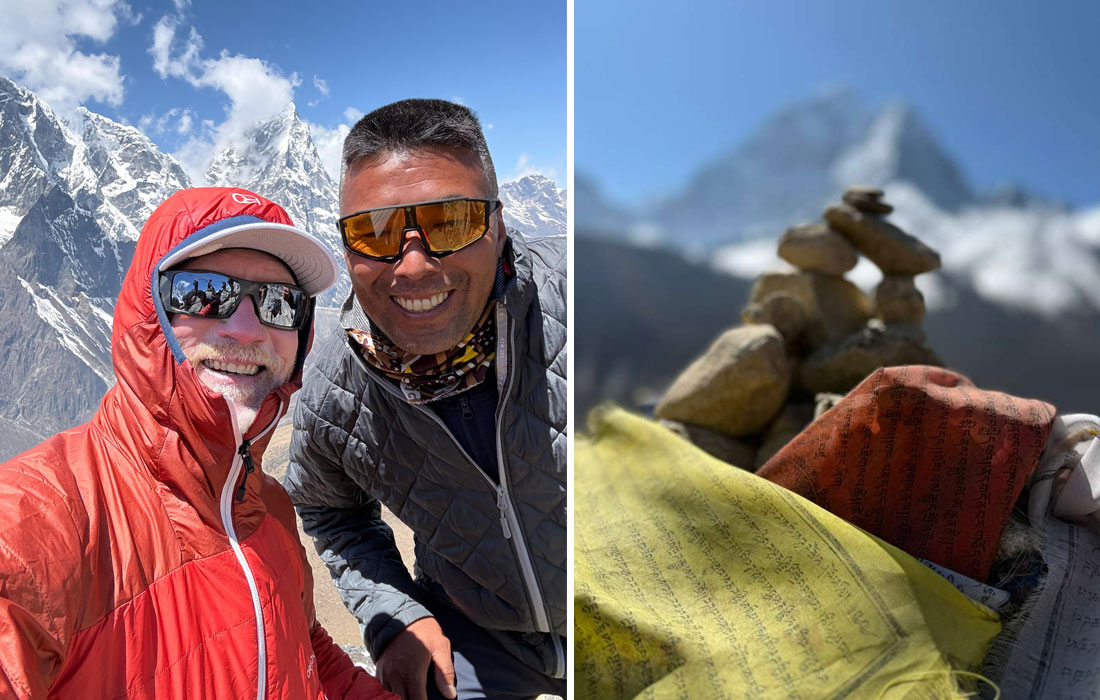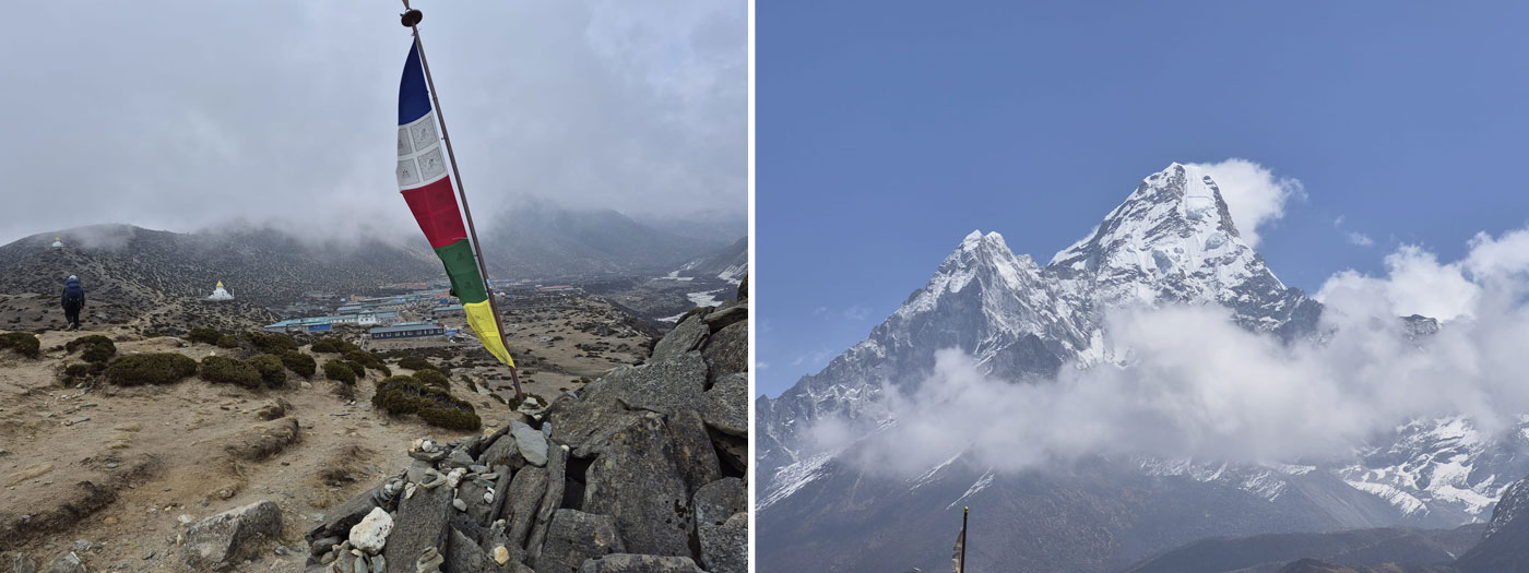 13 April - After staying up a bit late last night to honour the passing of one of the world’s greatest singers, Ms. Aasha Bhosle, and each of us sharing some of our favorite music and songs from around the world, we climbed into bed for a cozy sleep beneath puffy blankets. We could hear peaceful snoring through thin walls. This morning we arise early for our big day. We quickly eat a big breakfast and pack up, ready for a big day of trekking, our human batteries recharged after yesterday’s rejuvenating rest. Our host Mr. Lhakpa lights the incense burner to wish us a safe journey and the beautiful smell of burning Juniper wafts over us as we set off up the trail. One of our Everest climbing team members did not sleep well, so he is staying behind with his Sherpa to visit the Namche Doctor for a checkup. His plan is to recover in the comfort and warmth of Namche before heading higher. There is no rush, as we have 60 days for our expedition and we want him to get healthy before ascending higher. That fits in with one of the mottos of our expedition: “Arrive Alive”. Don’t stumble into camp and collapse into your tent as if some kind of wrecked basket case. Now our hiking team is ready and we begin our walk along a sunny warm rolling path with amazing views of Ama Dablam and the Everest Massif. We walk through peaceful pine forests, winding around steep mountain sides high above the Dudh Khosi River Gorge far below. Then we drop. Far far down, into the Gorge itself. We come to Fungki Thangka, a small group of terraced teahouses under an ancient huge Hemlock Tree, beside the rushing river and just below a chain of water powered prayer wheels cascading down the hill above us. Its time for a delicious fried noodle and cheese lunch and a place to kick our feet up and bask in the sun. Now we are ready to go. Through an Army checkpost where they check our paperwork and write down our names in a book. Now we are hiking up a brutal hill. This hill is very tough, seemingly never ending, with so many switchbacks. We are shuffling uphill, panting, step by step, our breathing is heavy and hearts are pounding, still we manage to go on. The hiking is difficult, one foot in front of the other, but Rhododendron trees here are blooming bright red and pink, giving us visual encouragement with such beauty flickering through the foliage all around us. Thankfully after several grueling hours, we top out on the hill at Tengboche Monastery, really the biggest monastery in the Khumbu, with large dragons guarding its gates and a huge prayer hall inside. Its like we are inside an enormous mountain pass. Looking up valley we can see Ama Dablam and the Everest Massif. Looking down we can see all the way toward Namche, Phakding and Lukla. Mt Thamserku looms directly above us like an icy dragon. A commanding spot to be sure. Monks are blowing their long brass trumpets and rhythmically banging on drums. It’s a prayer ceremony known as a Puja. A little lower down the pass there is a group of restaurants and we head there for a fine cup of cappuccino and freshly baked chocolate cake on an outdoor terrace, surrounded by this massive monastery and these towering peaks with the sound track of the prayer ceremony flowing around us. Ok, break time is over. Time to get going, time is wasting, we aren’t there yet. We head down hill, toward Everest, through Rhodendron forests, hoping to spot a rare endangered musk deer, down to the village of Deboche. Visiting the Women’s Monastery, we see that all of the buildings are locked up and it looks as if the gardens have not been planted. Carrying on we cross high walls above the river and through the narrow needle’s eye-like cliffs of Deboche Gorge on a bouncing suspension bridge and then its time for an uphill hike (yes yet another hill) on wide and well graded trails, up through the Pangboche gate. We are in scrubby small juniper tree/bushes now, almost above the treeline. A few curves in the trail and we are so relieved to see the potato fields of Pangboche stretching out widely to our right, on very broad earthen benches above the river. We enter town and the trail winds past many teahouses and swelling piles of carved Mani stones. We cross a final stream and come to our teahouse for the night: Sonam Lodge. The dining room is warm and cozy with big windows, the rooms are comfortable with attached baths and the food is superb, prepared by our skillful hosts Yangjie and Gyermen. Their daughter Shyang Angmo is home form Namche School for the holidays. She’s entertaining us with funny games on paper and her mobile. At one point she traces a picture of the Guru Rimpoche Statue which sits on the hill top above town. We’ll see that tomorrow! Well today was a very challenging day. But rewarding. Perhaps we might say: where there is adversity, there is strength. Lets see how we sleep tonight!