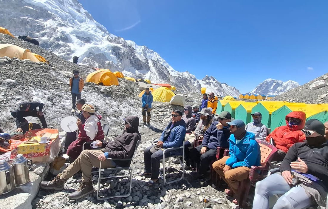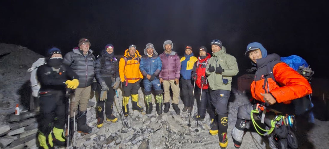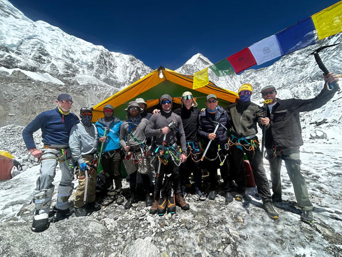 Caption : Team ready to leave BC to check the serac between base camp and camp one. Photo : Sange.