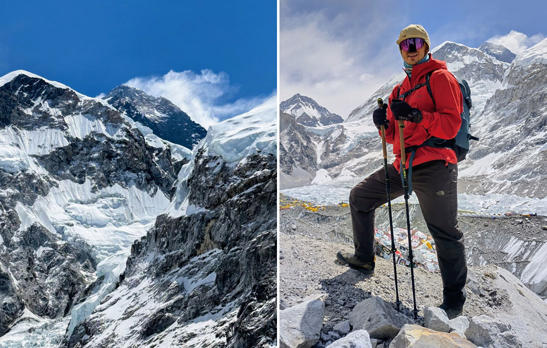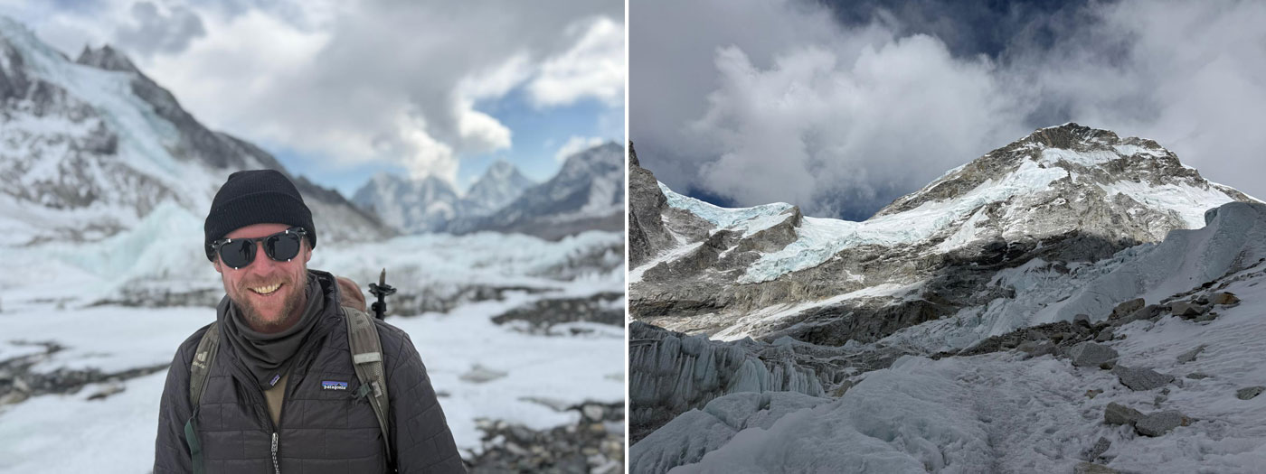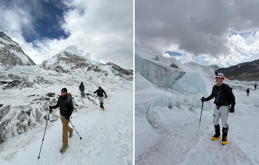 Caption : Team member and climbing sherpa at BC. Hiking around Everest Base Camp. Photo : Luke.