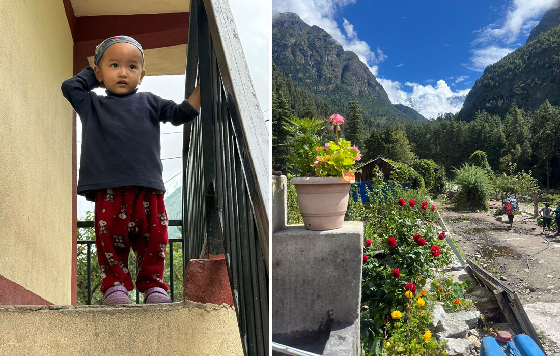 Caption : The little joys of trekking, a boy waving at us, flowers in bloom, and a touch of clouds in the sunny sky. photo by Lars E.