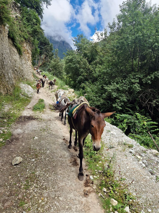 6 Sep -We had a leisurely breakfast in the lovely Gowa Lodge dining room, then set off on a gorgeous sunny morning beneath blue skies dotted with a few puffy clouds. We climbed up through the Dudh Kohla valley, passing through thick coniferous and deciduous forests. The path remained wide more like a road, really traversing high above the river, until it suddenly ended at a motorbike parking area where the Soti Khola joins the main river. There, two charming small lodges made the perfect spot for tea in the shade of juniper trees and flower-filled gardens. From that point, the trail grew narrower and muddier a true donkey track until we joined a newly built path, even equipped with stone steps and handrails in places. This new trail seemed far more donkey-proof. Kudos to the trail builders and ACAP well done! After a steep climb through foggy jungle, we emerged into a wide meadow and arrived at Yak Karka just as the rain began to sprinkle. We are now staying in a very comfortable tea house with fresh new bedrooms and a warm wooden dining room. They even lit the wood stove for us tonight. How pleasant!
