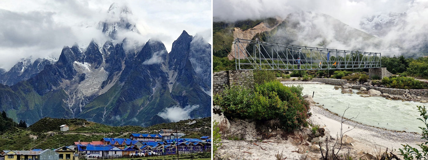 Caption : A perfect trekking day: scenic lodges, towering Larkya Pass, and the rhythmic crossing of iron bridges towards the Dudh Koshi. Photo by Lars E.