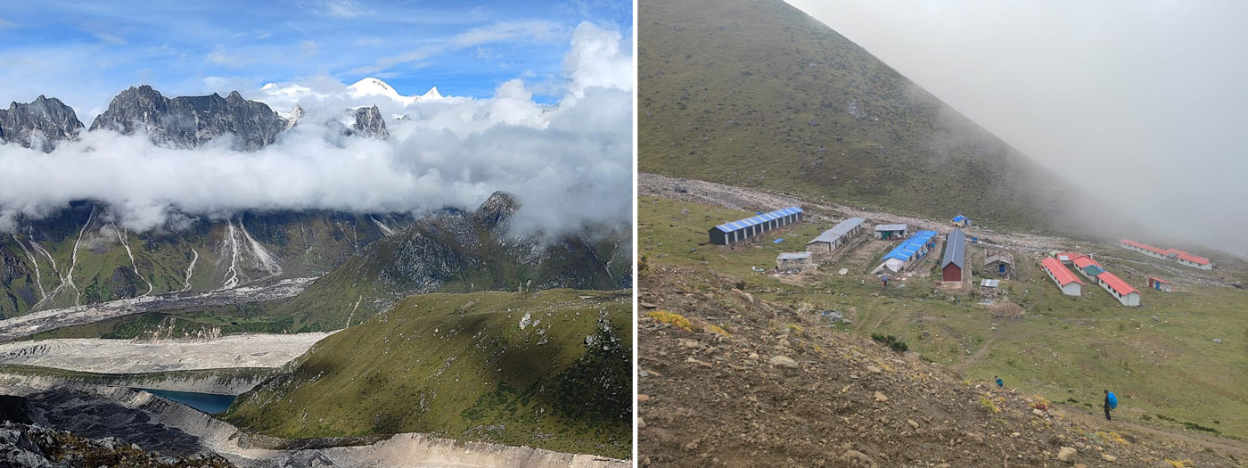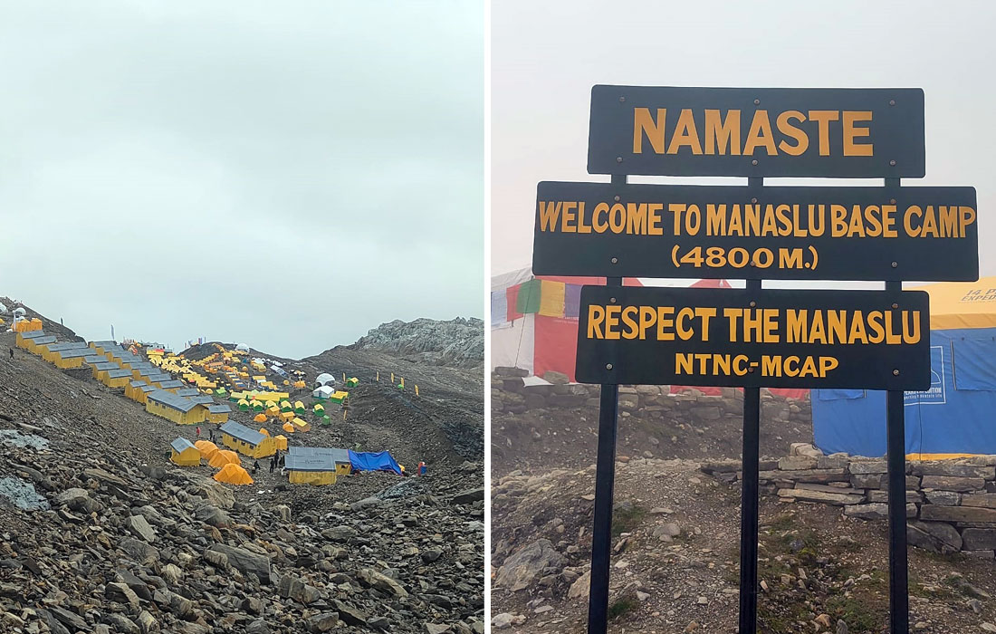 Caption : Manaslu Base Camp, embraced by clouds, with calm weather and tents standing strong. Video : Dorje S.