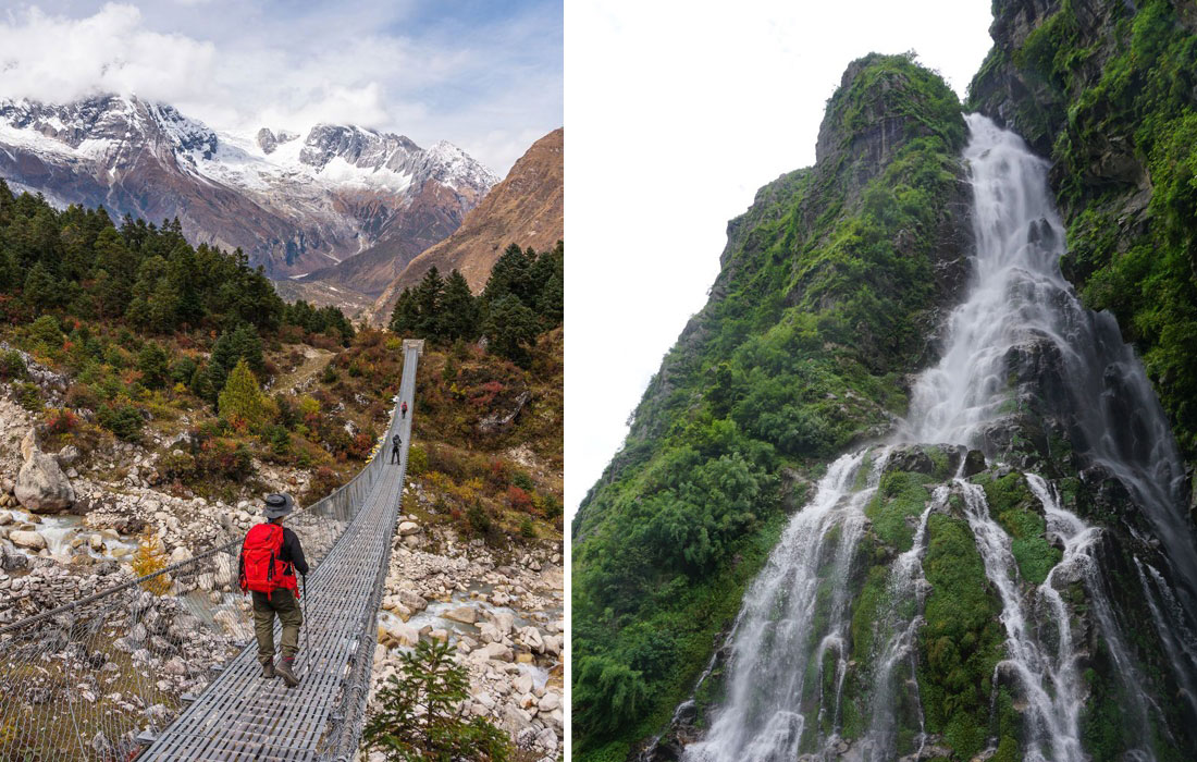 Caption : A perfect trekking moment – waterfalls, bridges, and mountains all in one frame.