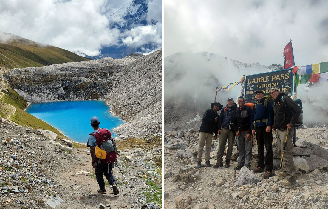 Caption : Members enjoying the stunning glacier lake and the thrill of Larkya La Pass at 5,160m on the way to Dharamsala. Photo : Mathias S. and Erikson.