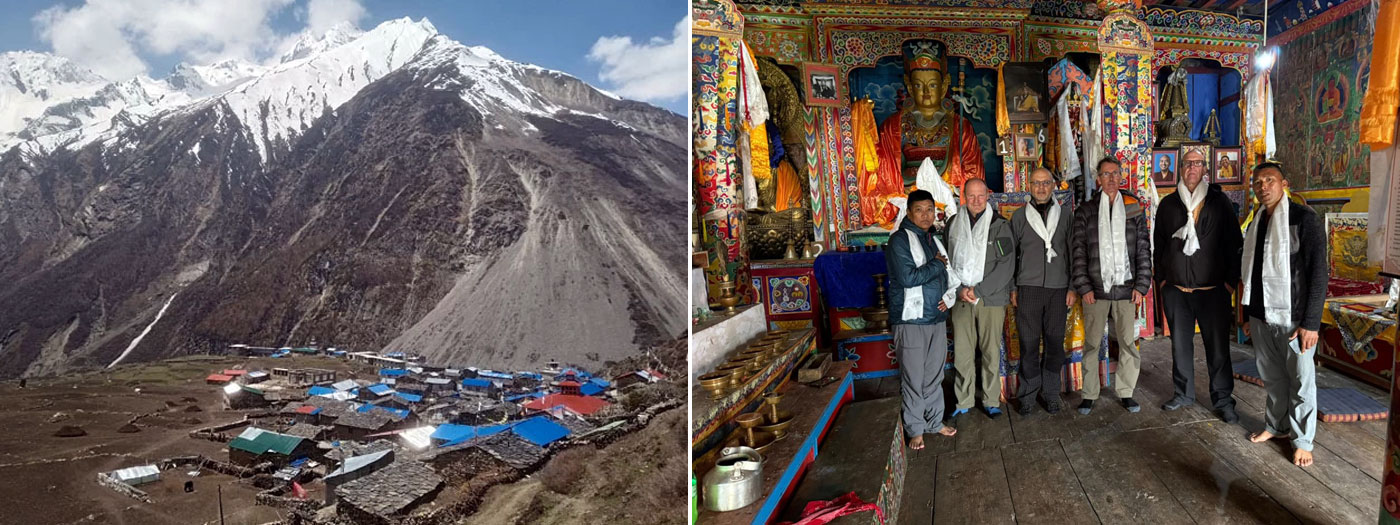 11 Sep - A leisurely, cloudy, and warm morning led into a gentle stroll to the local temple. There, we met the high priest a venerable yet energetic old gentleman who conducted an elaborate 30-minute prayer ceremony exclusively for our team. The ritual involved ancient Tibetan texts, pitchers of sacred liquids, bells and prayer shakers, crimson strings, prayer flags, and the steady beat of a massive wooden drum. He blessed all our team members and Sherpas as we sat on benches along the side of a tall golden hall, filled with statues and every surface ornately painted with ancient Buddhas, crowned by an impressive cupola skylight. We knelt before the lama and recited chants while he tied a sacred prayer string around our necks, as we presented him with a prayer scarf containing something special. After the ceremony, we explored the monastery grounds, discovering numerous temples and guesthouses, and found the place to be vast and deeply impressive. The rest of the day was spent sipping handmade cappuccinos, enjoying fresh homemade apple pie, sharing stories of our homes and families, and simply relaxing a fine, restful day in the lovely village of Samagaon.