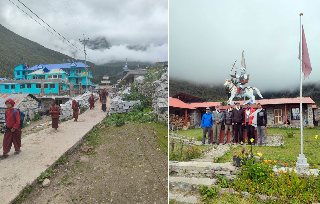 Caption : Watching young monks go to school. Offering khadas in Samagaun.