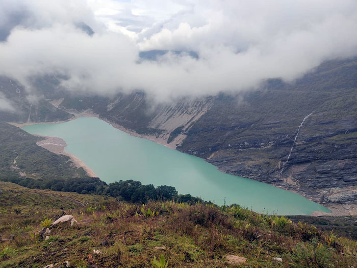 Caption : The trek revealed breathtaking views – Birendra Lake below and the mighty Manaslu Glacier cascading from the cliffs across the valley.