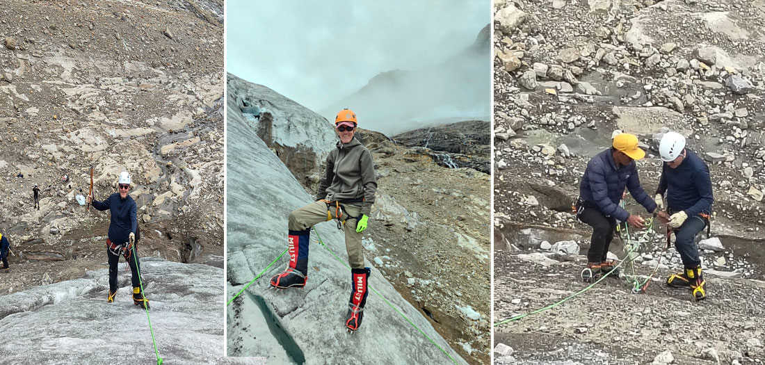 Caption : Ice Training at Manaslu Base Camp – Practicing with harnesses, helmets, crampons, ascenders, ice axes, descenders, and safety lines for safe climbing. Photo : Dorje S.
