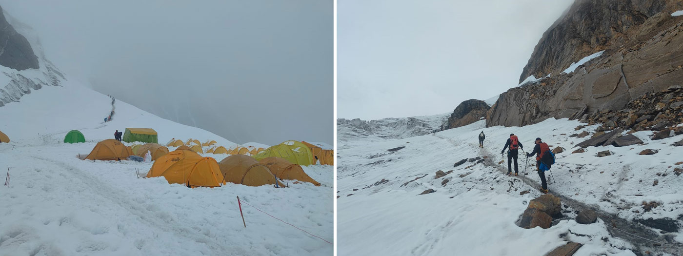 Caption : Snow, tents, and a cloudy day, walk at Camp 1, Manaslu. Photo : Dorje S.