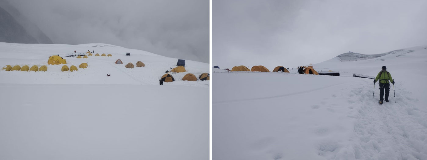 19 Sep - It snowed 8cm in C1 last night. This morning we woke up feeling ok, so had breakfast and then walked up hill for several hours, exploring the route to C2 and reaching for higher altitudes. There is new snow on the route, but not too much, so avalanche danger is minimal. We came back down to C1 in the afternoon, had soup and hot drinks, took a nap, and then had an early dinner (we have our own cook and kitchen up here in C1 !!!) It was misty today, but did not rain and snow too much, and there is no wind. We are acclimatizing and we feel pretty good so far. We are drinking lots of water and tea and juice. Trying to stay well hydrated and focusing on acclimatization. Good night!