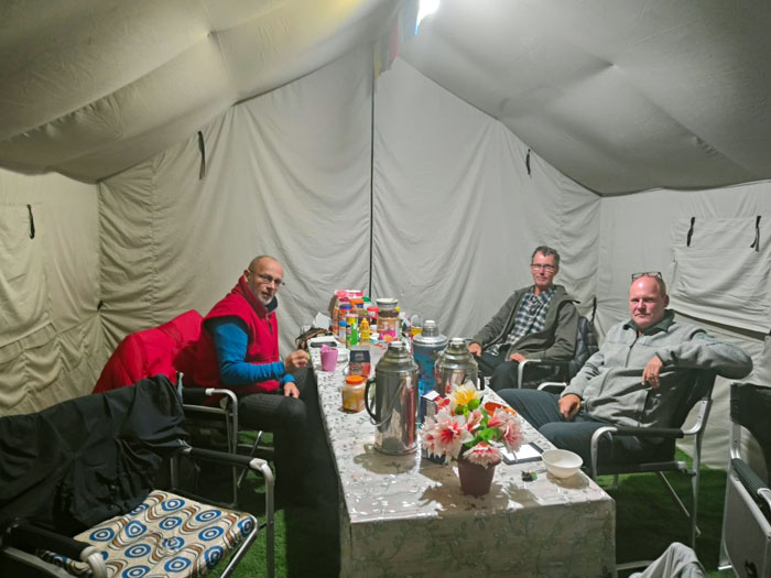 Ours is quite an elaborate basecamp overall. Once we settled in, the clouds parted, giving us a magical evening view of the Manaslu summit and the Camp 3 and Camp 4 areas. Truly special! The kitchen team prepared an incredible evening meal for us, and we really felt: Welcome to Manaslu Basecamp!