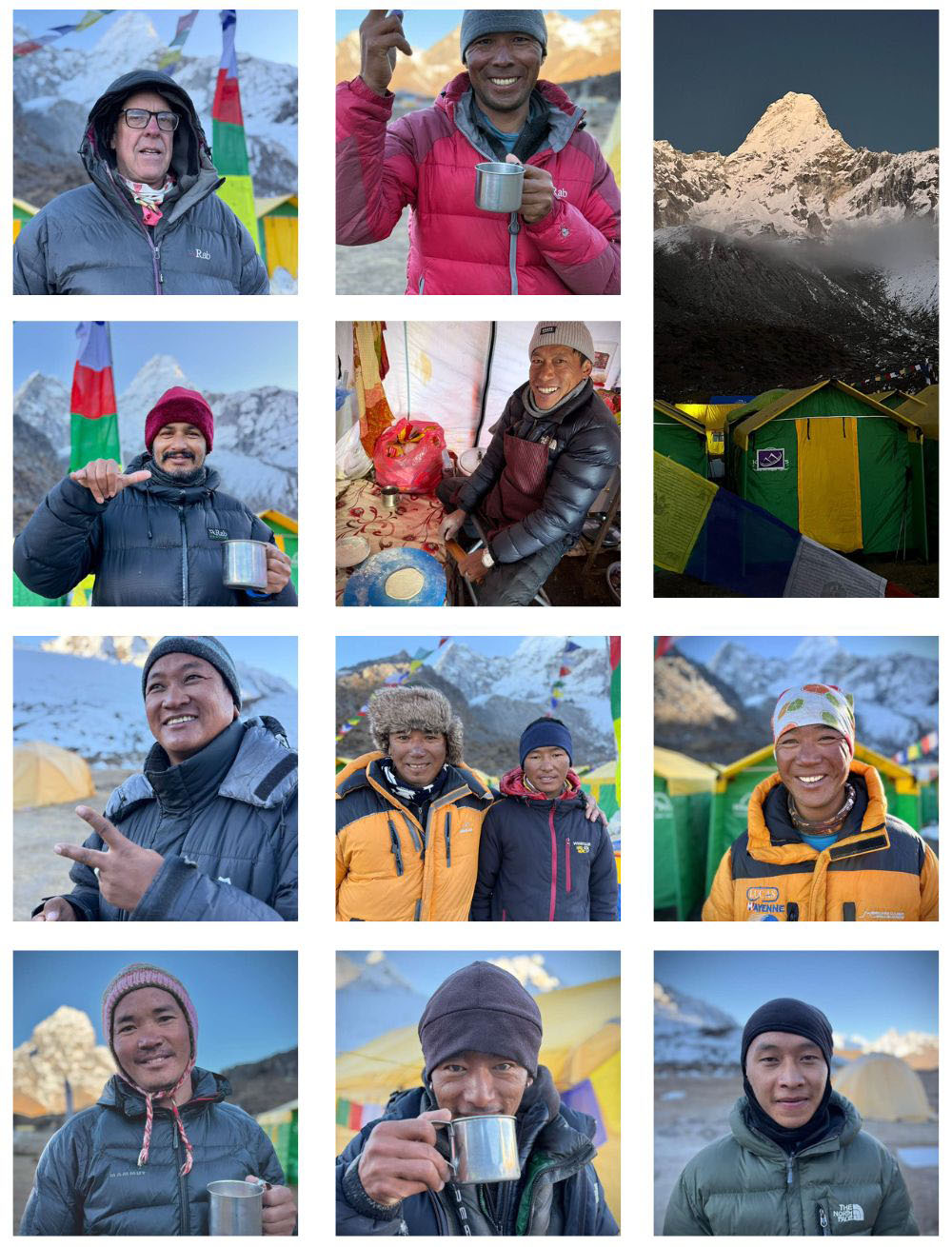 High Altitude Climbing Sherpas, Cooks, Basecamp Managers: Tenji Sherpa, Ang Dorji Sherpa, Gyalji Sherpa, Sange Sherpa, Dawa Jangbu Sherpa, Pasang Nuri Sherpa, Dawa Sange Sherpa, Lakpa Dawa Sherpa, Purba Sherpa, Kipa Sherpa, Jay Bahadhur Nagarkoti, Ang Dorjee Sherpa, Galji Sherpa, Pasang Sherpa, Dorjee Lama.